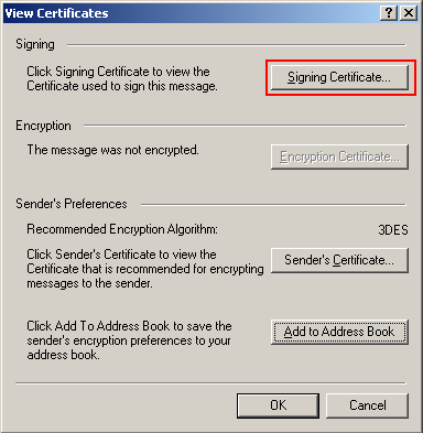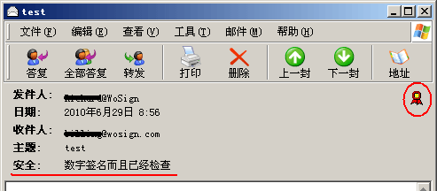 (3) 如下图 5 所示,收件人收到签名邮件后, Outlook Express 会提示已经收到一个数字签名邮件, OE 会自动验证签名是否有问题、签名证书是否有效和是否由 全球信任的证书颁发机构颁发、邮件是否被篡改等。以下截图为英文Outlook Express收到数字签名邮件后的显示,主要让您了解您的国外买家收到您的签名邮件时是什么样的。红框中英文提示意思是:数字签名的邮件让您验证邮件的真实性,并且保证邮件在传输过程中没有被篡改。