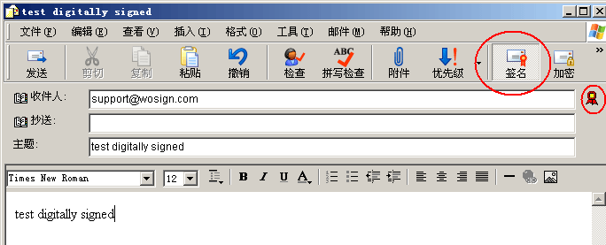 (2) 证书设置成功后,就可以数字签名电子邮件了。如下图 2 所示,创建邮件后,只要在“工具”中点击“数字签名”即可,会显示一个勾号。如果您已经把签名功能按钮设置到功能按钮栏,则直接点击“签名”按钮即可。在发件人的后面会显示一个红色的证书图标