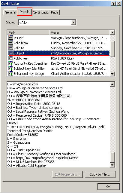 (5) 买家可以点击“View Certificate"(查看证书),会显示下图8所示,再点击“Signing Certificate"(签名证书)就可以查看证书的详细信息,也就是您公司的营业执照上的重要信息,如下图 9 和图10所示: