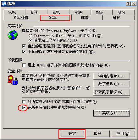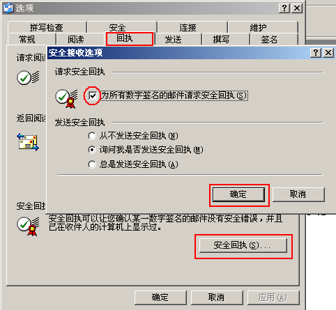 推荐设置所有发出邮件都自动加上数字签名和自动要求安全回执,设置方法如下图3和图4:在“工具 - 选项 - 安全” 中选中最下面的”在所有待发邮件中添加数字签名“后点”确定“即可自动添加数字签名,在“工具 - 选项 - 回执” 中点击”安全回执“,再选中”为所有数字签名的邮件请求安全回执“就可以让您的买家收到签名邮件时有确认邮件没有被篡改和已读回执。