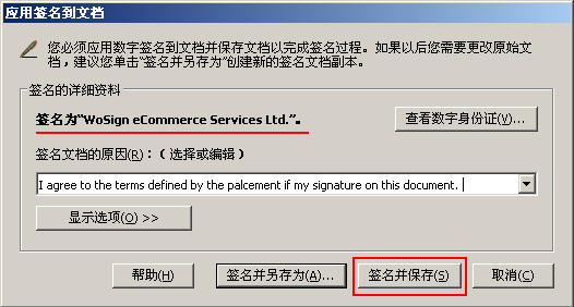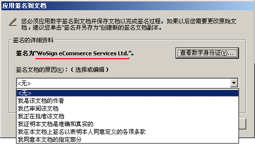 第 3 步 :会自动显示签名单位名称。并要求填写签名原因,如下图5、6所示,有可选的6中选项,如果您使用中文版Adobe Acrobat,则建议您不要选择这些选项,选“无”,替换自己填写的原因,如:I agree to the terms defined by the palcement if my signature on this document. 点击“签名并保存” 或 “签名并另存为” 就完成签名。