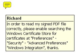 最后,为了照顾没有设置信任Windows根证书的用户能正确验证数字签名,建议您在生成PDF文件后在文件的前面加上一个附注,附注内容建议为: In order to read my signed PDF file correctly, please enable searching the Windows Certificate Store for certificates at "Preferences" - "Security" - "Advanced Preferences" "Windows Integration", thanks. 点击附注标志,就会显示如下图10所示的提示: