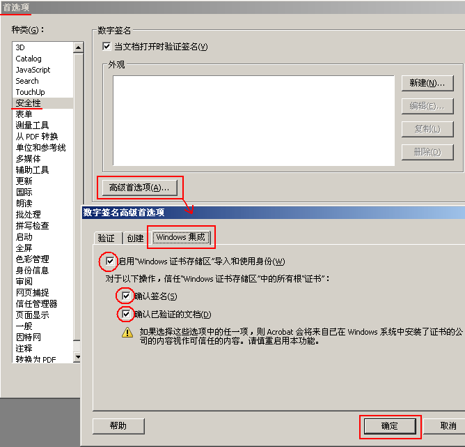 第1 步 : 打开 Adobe Acrobat 7.0 ,点击“编辑”-“首选项”,再点击“安全性”, 点击“高级首选项”,再点击“Windows 集成”,如下图 2 所示,打勾选中“启用'Windows'证书存储区导入和使用身份”、选中“确认签名”和“确认已验证的文档”,再点击“确定”即完成信任设置: 如下图 1 所示。