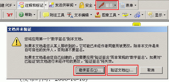 第 2 步 : 使用Adobe Acrobat打开PDF文件,点击主菜单上的“签名”即可,会让您选择是“数字签名”还是“验证文档”,如下图2、3、4所示,选择“继续签名” 按照提示即可完成签名: