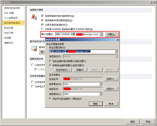 b) 在加密电子邮件下面, 点“设置”,出现“更改安全设置”对话框。单击“确定”接受默认值。如图下所示。