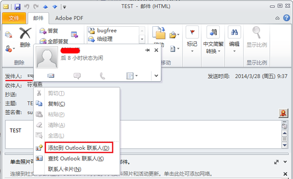 c) 右键点击发件人(A帐号),选择添加到Outlook联系人,如图所示,点击保存。完成这步的目的是为了演示发送加密邮件给A帐号。若要成功发送加密电子邮件,必须拥有收件人的数字证书。