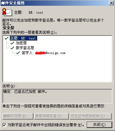 b) 单击“加密”标识后,将显示“邮件安全属性”对话框,以指明该加密邮件是有效的。如图所示。
