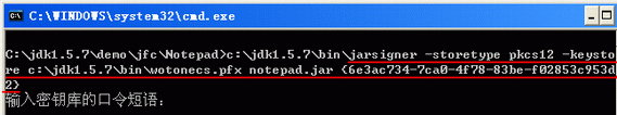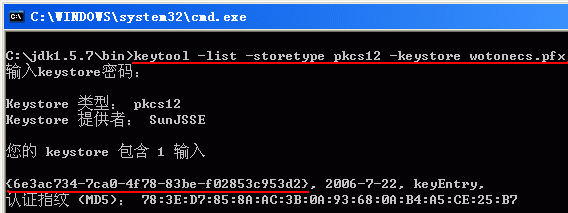 如下图1所示,会提示您输入私钥密码,显示您的Keytool可以读出此PFX格式证书。请注意下面的第2条红线显示的内容为您的签名证书的别名,下面签名时需要输入此别名。