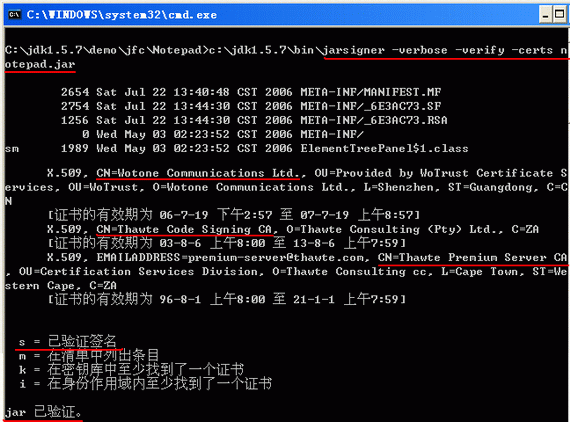 如下图3所示,会显示签名证书所有信息,包括软件发行商的名称(CN=,图中红色画线部分)、证书颁发机构的中级根证书和顶级根证书,在最后面会显示“已验证签名”和“jar已验证”。