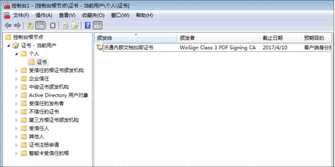 开始 -〉运行 -〉MMC,启动控制台程序 -> 选择菜单“文件 -〉添加/删除管理单元”-> “添加”->“可用的独立管理单元”列表中选择“证书”-> 选择“当前用户”。 在控制台的左侧显示证书树形列表,选择“个人”- “证书”,右键单击,选择“所有任务-〉导入”, 根据“证书导入向导”的提示,将.pfx 格式文件导入“根据证书内容自动选择存储区”。(注意导入过程中勾选该选项,并且需要输入密码)导入成功后,可以看到如图 2 所示的证书信息: