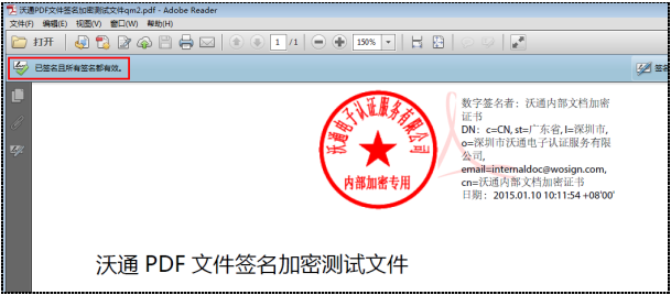 签名后的文件,无论是使用 Adobe Reader 还是使用 Adobe Acrobat 都会显示 “已签名且所有签名都有效”,如下图 8 所示: