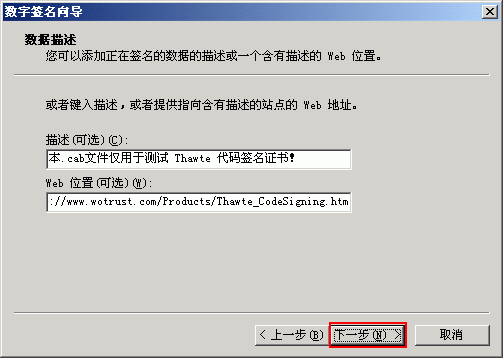 (8) 如下图 8 所示,要求填写该签名代码的功能描述,推荐一定要认真填写,因为此信息将会在最终用户下载此代码时显示,有助于最终用户了解此代码的功能以确定是否下载安装。第一行“描述”是指此代码的功能文字描述,第二行“ Web 位置”则让最终用户点击文字描述来详细了解此代码的功能和使用方法等,本演示中的“ Web 位置”为 Thawte 代码签名证书简介页面: