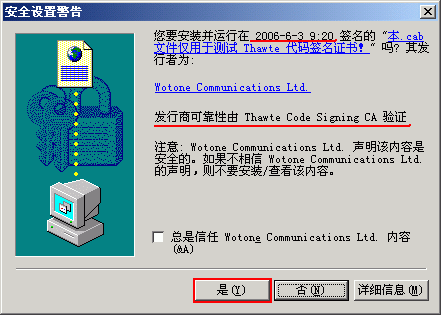 (11) 现在,需要使用 chktrust.exe 来查验已经签名的代码, chktrust.exe 文件已经打包在 Signtool.rar 中。进入 DOS 命令提示符,并进入已经签名的文件所在目录 ( 如: d:\sign\ TestSign.cab) ,键入命令: chktrust testsign.cab ,则会显示实际应用时在 IE 浏览器下载页面的情况,如下图 11 所示,第 1 行的红线部分就是时间戳记录的签名时的本地时间,请注意:此时间不是取签名电脑的时间,而是 VeriSign 提供时间戳服务的服务器计算出来的签名电脑设置的所在时区的本地时间。第 1 行蓝色文字就是在第 8 步中输入的描述文字,点击此蓝色文字就可以访问在第 8 步中输入的 Web 描述页面。第 2 行蓝色文字则为该代码的发行者,也就是代码签名证书的申请者 ( 拥有者 )( 如: Wotone Communications Ltd.) ,点击可以查看证书的详细信息;第 2 行有红色下划线部分显示“发行商可靠性由 Thawte Code Signing CA 验证 ”就是此代码签名证书的证书颁发者。