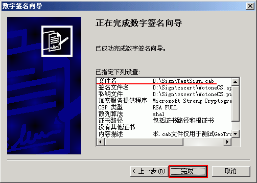 (10) 点击“下一步”后,如下图 10 所示,会提示已经完成数字签名向导,点击“完成”后还会提示您输入私钥密码,就完成代码签名证书的代码签名。
