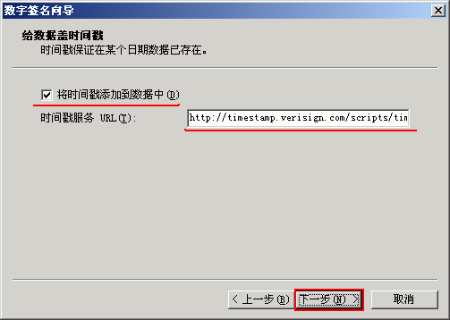 (9) 点击“下一步”后,如下图 9 所示,选中“将时间戳添加到数据中”,请使用VeriSign 免费提供的代码签名时间戳URL:http://timestamp.verisign.com/scripts/timestamp.dll 。