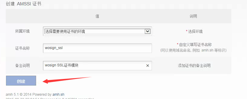 首先创建一个证书模板,环境选择Inmpssl,证书名称,备注说明填写任意好记的名称,点击创建。