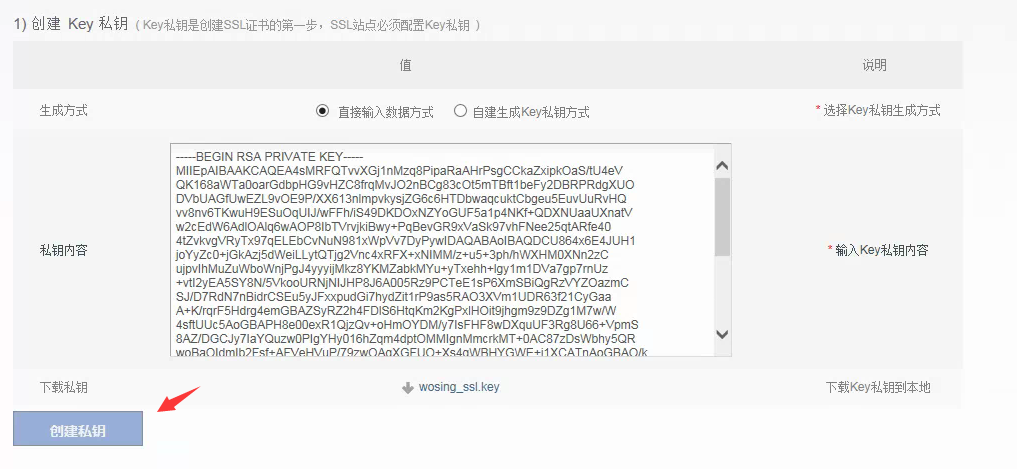 使用记事本打开私钥文件.key复制里面的内容,在刚刚打开的配置界面,找到1)创建Key私钥,生成方式选择默认的‘直接输入数据方式’,粘贴到下图所示私钥内容位置(注意不要添加空格),点击创建私钥按钮。
