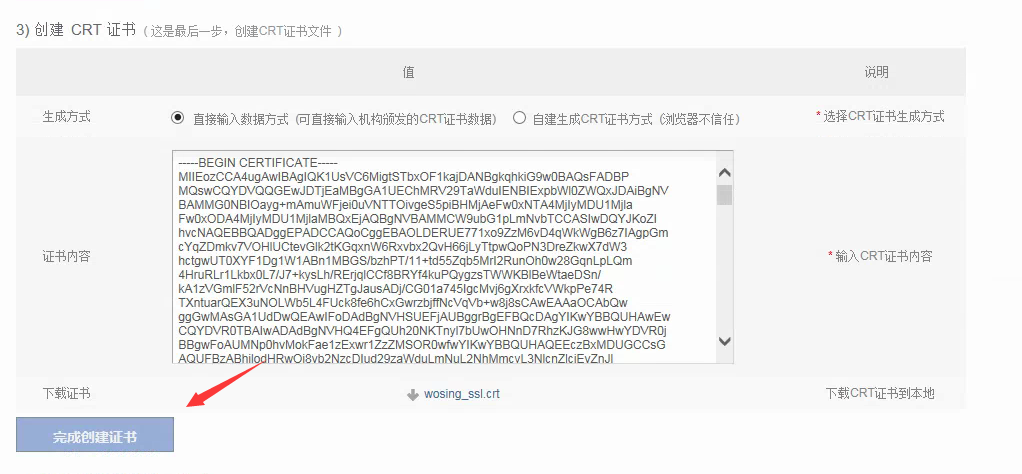 同样使用记事本打开公钥文件.crt复制里面的所有内容,然后找到3)创建CRT证书,生成方式选择默认的‘直接输入数据方式’,粘贴到下图所示证书内容位置(注意不要添加空格),点击完成创建证书按钮。