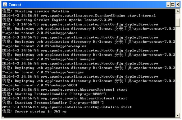 下载Tomcat 解压到其中一个盘符下后,进入 apache-tomcat-7.0.29 根目录下找到 bin 文件中此执行文件 windows:“startup.bat”(linux:“startup.sh”),运行期间将出现如 图 2所示的命令提示符窗口。