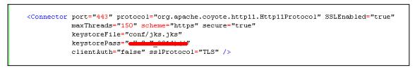 <Connector port="443" protocol="HTTP/1.1" SSLEnabled="true" maxThreads="150" scheme="https"secure="true"clientAuth="false" sslProtocol="TLS" keystoreFile="keystore/SSL.jks" keystorePass="证书解压密码" />
