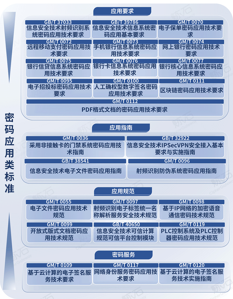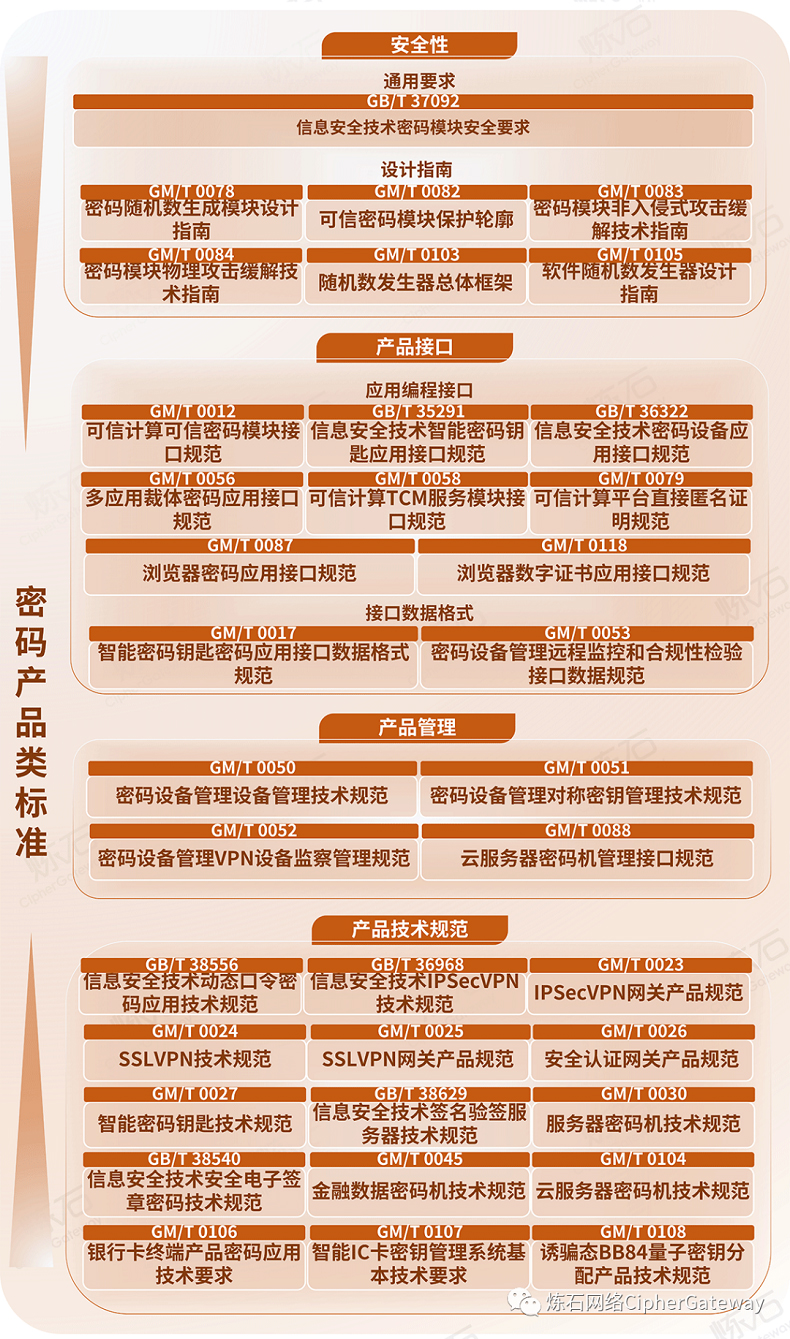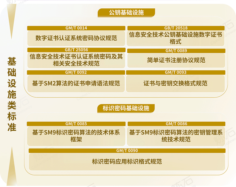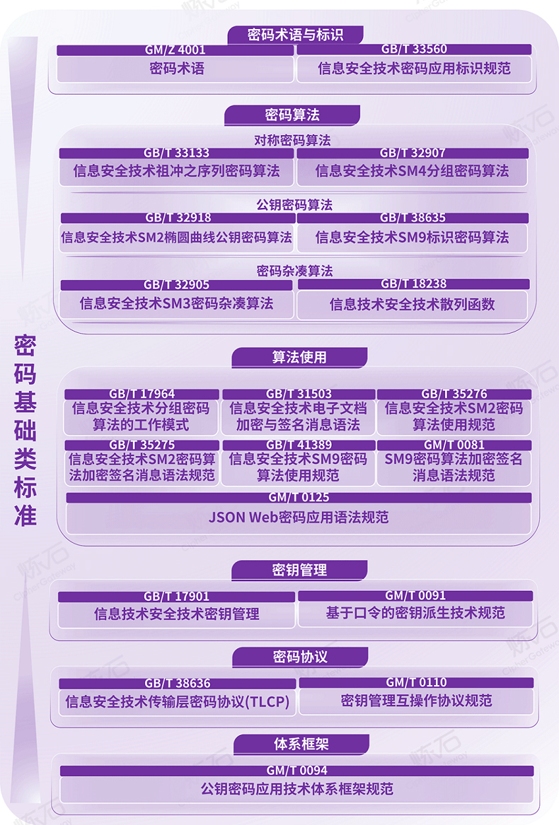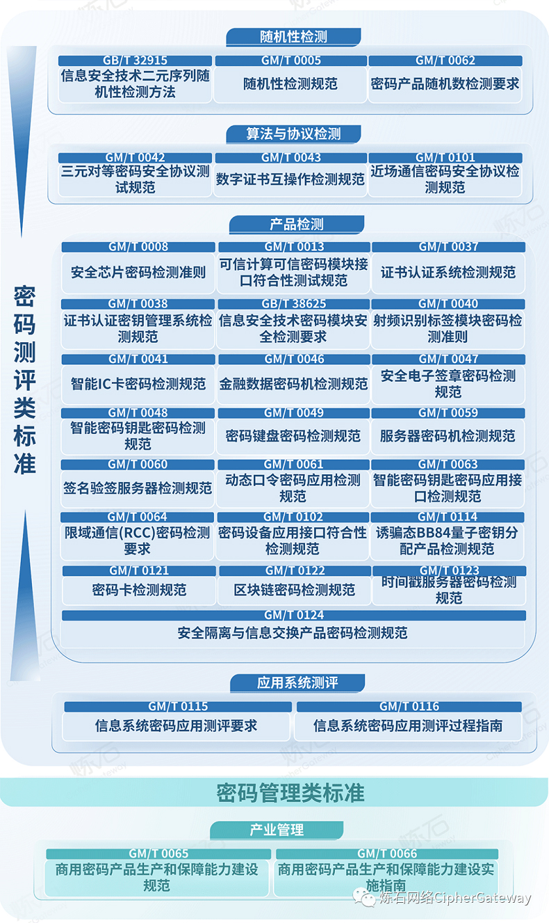 《GM/Y5001-2023密码标准使用指南》中对180余项标准归纳为密码基础类标准、基础设施类标准、密码产品类标准、应用支撑类标准、密码应用类标准、密码测评类标准和密码管理类标准等7类板块。