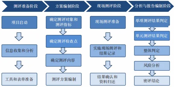 由图 1 可知,密评主要分为 4 个阶段:测评准备阶段、方案编制阶段、现场测评阶段、分析与报告编制阶段。