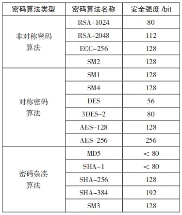 取值均为 1。各种类型的常用密码算法的安全强度如表 1 所示。