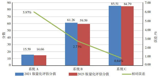 由图 4 可知,对于系统 A,其商用密码应用情况较差,在2021版下的量化评估分值为15.59 分,在 2023 版下的量化评估分值为 14.66 分。《商用密码应用安全性评估量化评估规则》修订前后系统整体测评结果量化评估分值相差0.93分,分值相对误差为 5.97%。对于系统 B,其商用密码应用情况一般,在 2021 版下的量化评估分值为 61.26 分,在 2023 版下的量化评估分值为59.59 分。《商用密码应用安全性评估量化评估规则》修订前后系统整体测评结果量化评估分值相差 1.67 分,分值相对误差为 2.73%。对于系统 C,其商用密码应用情况良好,在 2021 版下的量化评估分值为 85.51 分,在 2023 版下的量化评估分值为 84.79 分。《商用密码应用安全性评估量化评估规则》修订前后系统整体测评结果量化评估分值相差 0.72 分,分值相对误差为 0.84%。
