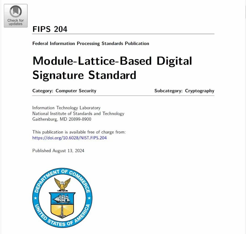 FIPS 204:作为数字签名的主要标准,该标准基于CRYSTALS-Dilithium 算法,用于数字签名任务,以保护信息的完整性、验证签名人身份;该算法已更名为ML-DSA(Module-Lattice-Based Digital Signature Standard的缩写),即基于模块格的数字签名算法。