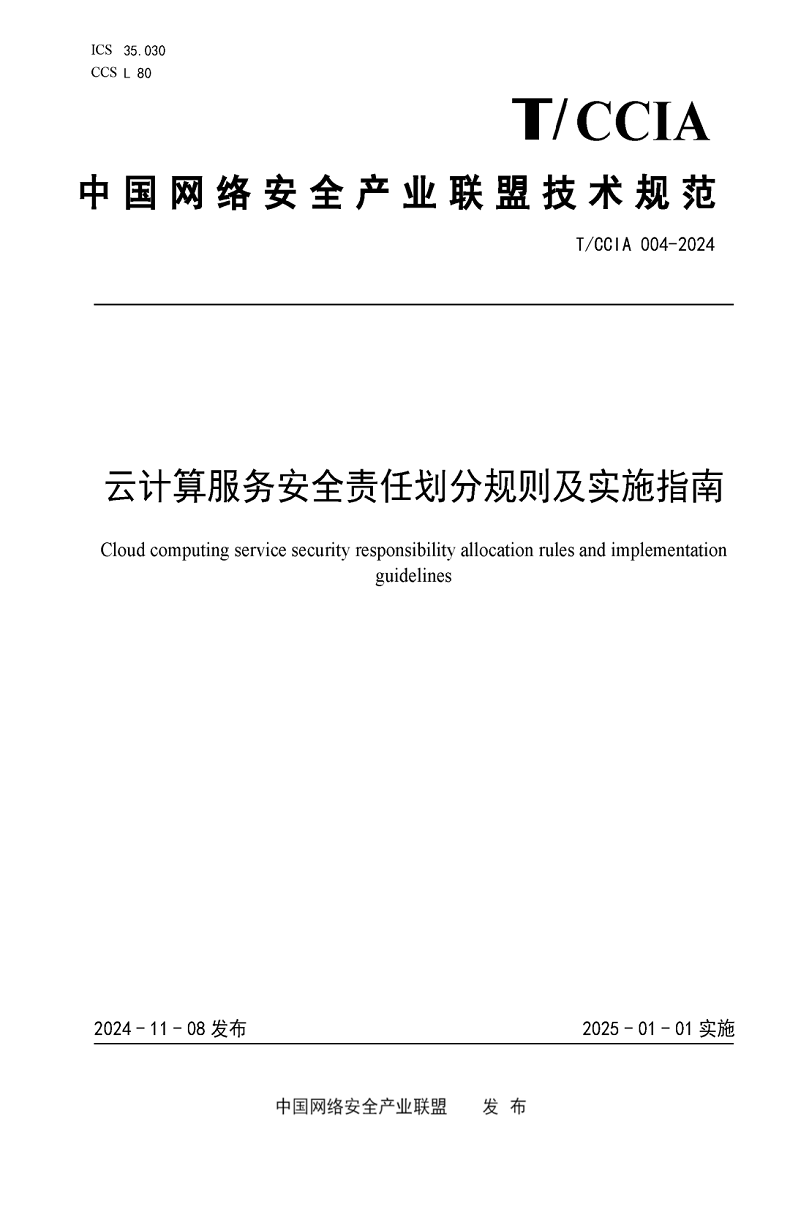 现批准《云计算服务安全责任划分规则及实施指南》为联盟技术规范,编号为T/CCIA 004-2024,自2025年1月1日起实施。
