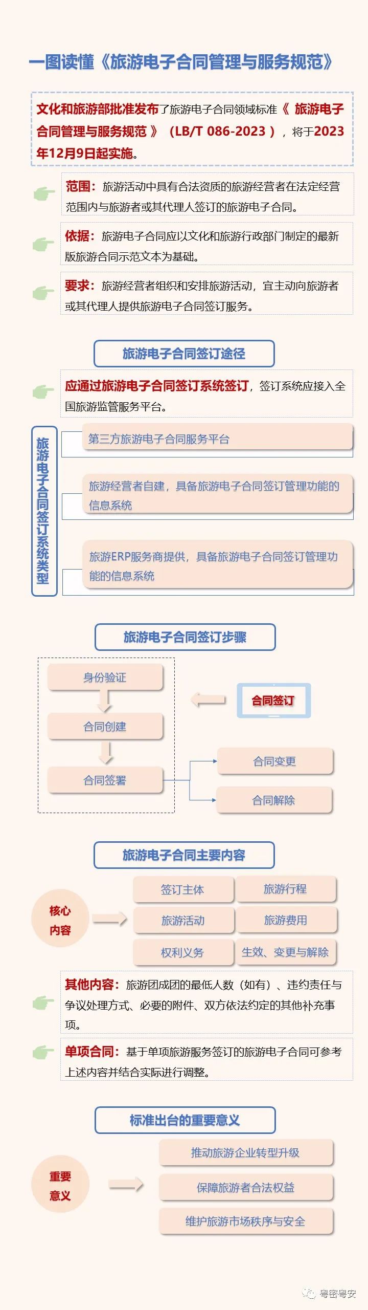 日前,文化和旅游部批准发布了旅游电子合同领域的行业标准《旅游电子合同管理与服务规范》(以下简称“标准”),将于2023年12月9日起实施。