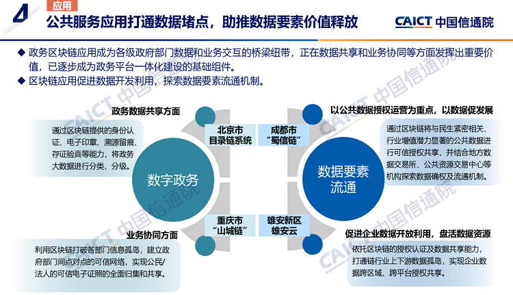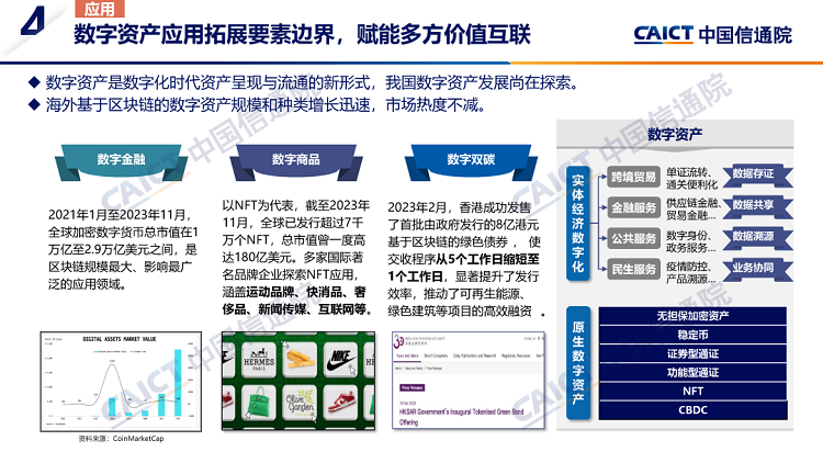 2. 区块链技术与公共服务、实体经济等领域深度融合。全球区块链应用范围从金融领域逐步向外延展,在实体经济、政务服务、公共服务、数字原生等领域加速落地,场景创新、模式创新层出不穷,行业生态逐步完善。此外,数字资产应用拓展了要素的发展边界,数字身份已成为数字世界的重要入口,区块链通过独特的机制正在成为促进数据要素供给流通与价值释放的重要基础设施,为构建Web3.0应用生态提供有力支撑。