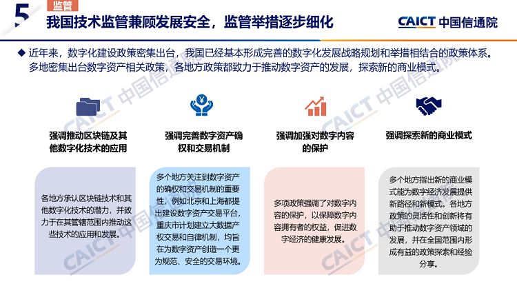 4. 全球加快优化区块链监管治理体系。全球范围内多个国家和地区正加快推动区块链监管治理体系优化,探索基于区块链的Web3.0、数字资产等发展路径。我国地方政府积极开展相关布局,以政策扶持、机制创新等方式促进产业发展与监管合规同步推进,为数字经济发展提供新路径和新模式