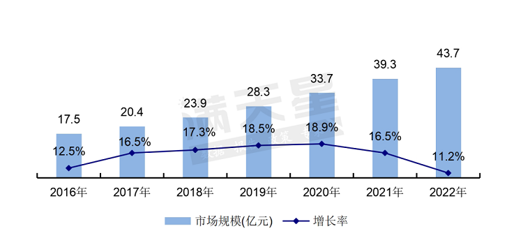 图1 2016-2022年中国网络安全测评及认证服务市场规模及增长率