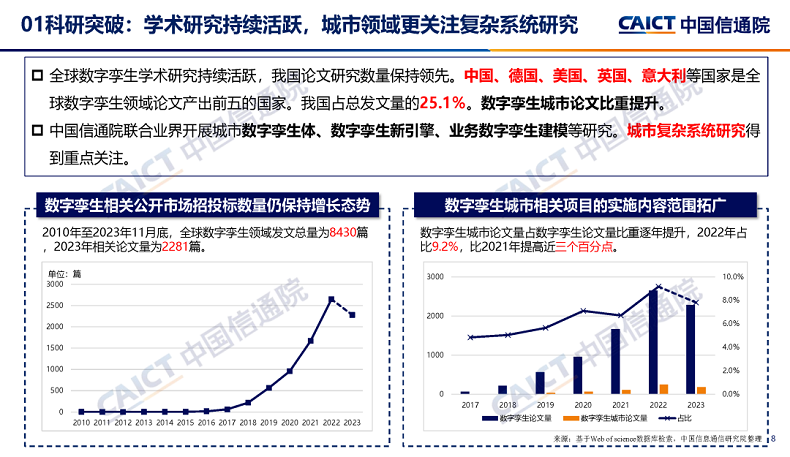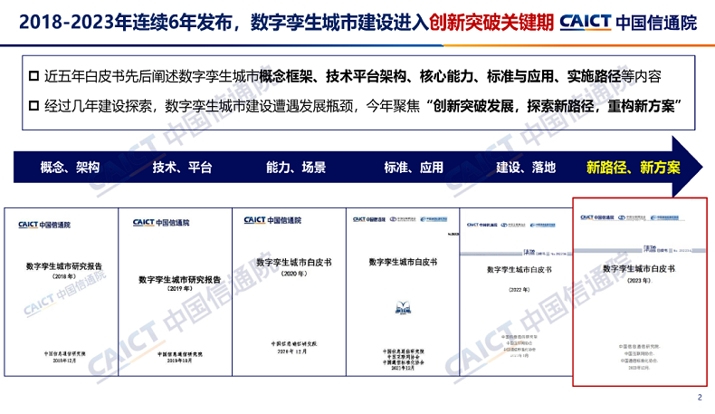 本白皮书是中国信通院连续第六年针对数字孪生城市的跟踪研究成果,通过多维度分析数字孪生城市发展全貌,创新提出城市数字孪生体、对象语义化和场景语义化模型、数字孪生新引擎等数字孪生城市建设的新路径新方法,以期突破多元异构数据难融合、技术互操作有壁垒、场景价值难显现等发展瓶颈,推动数字孪生城市真正落地。