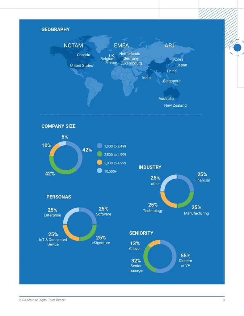 在今年的调查中,我们采访了北美、欧洲、中东、非洲和亚太地区300家企业的高级决策者,以评估他们在实现数字信任方面的进展。这些公司的员工人数少则千人,多则一万多人。
