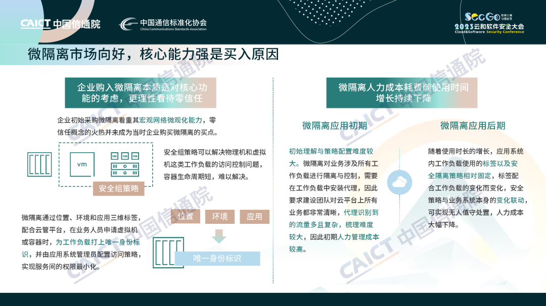3. 用户对零信任建设尚存顾虑,同时肯定零信任核心价值。一方面,零信任从零到一,落地部署面临多重阻碍。一是,零信任的概念产品居多,投入产出比是企业核心考量点。二是,零信任部署跨企业多部门,迈出建设第一步前需明确责任边界。三是,基于零信任的统一身份管理体系在接管组织内老旧系统时面临技术与规划设计双重阻碍。另一方面,微隔离市场向好,零信任应用价值受到肯定。一是,微隔离人力成本耗费随使用时间增长持续下降。二是,企业通过使用零信任降低代码流失率、资产管理精确到人以及实现个人效能监测,肯定了零信任的使用价值。