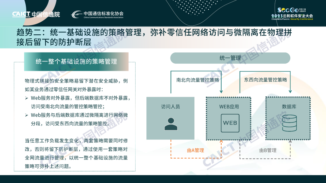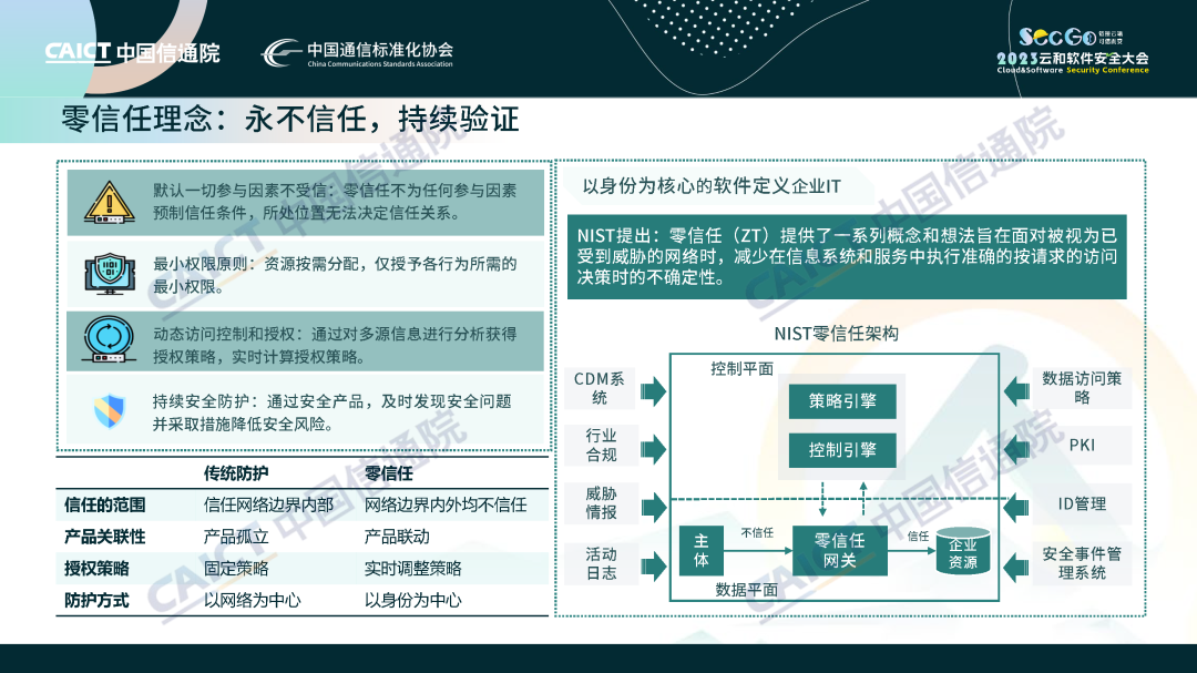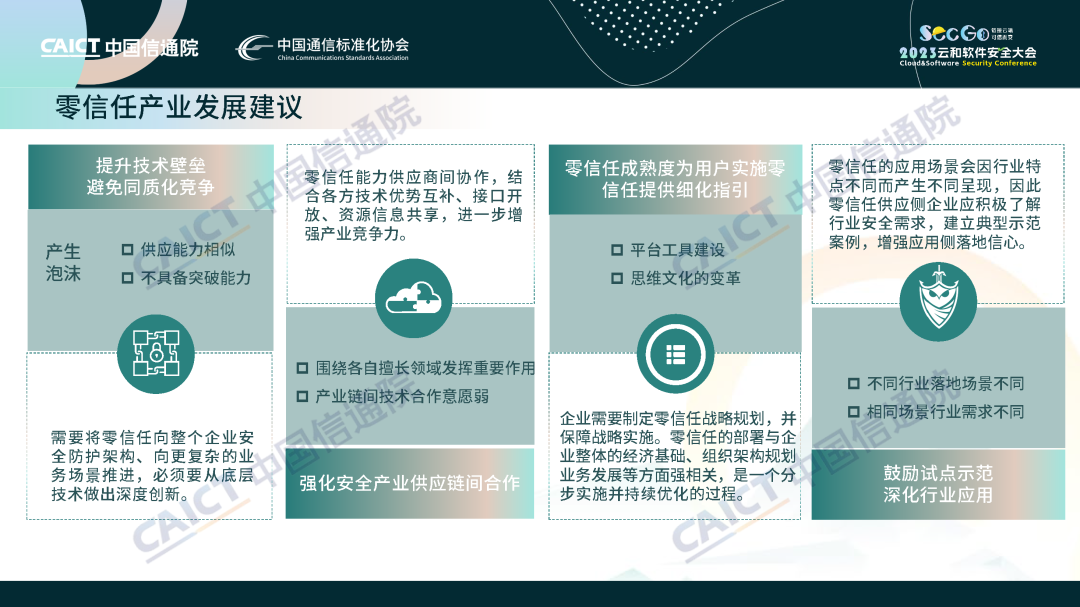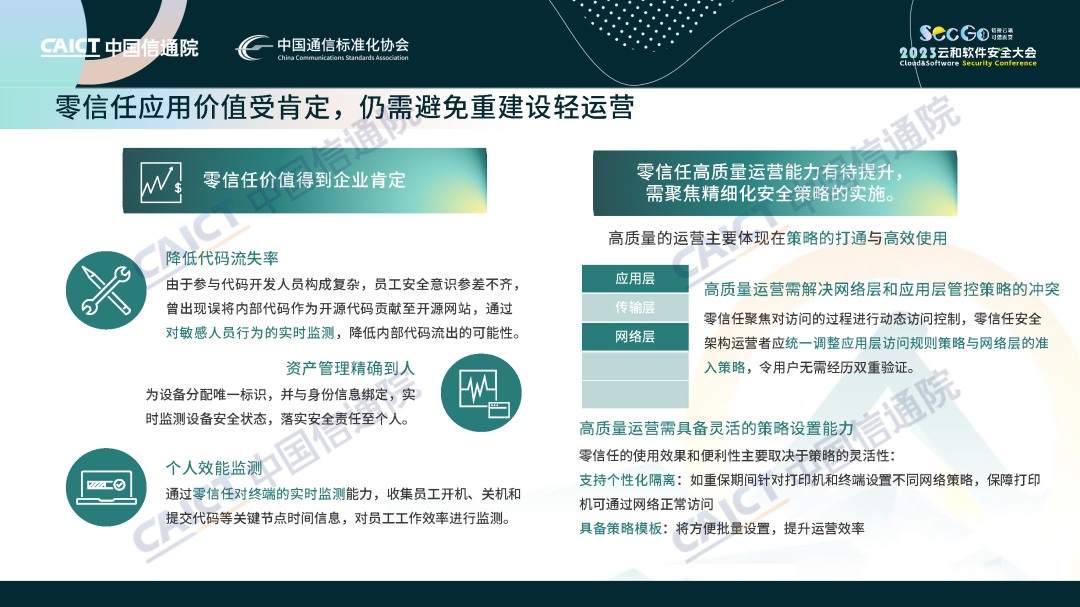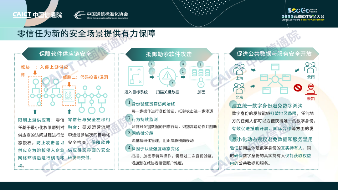 1. 零信任为新的安全场景提供有力保障。一是零信任保障软件供应链安全,零信任基于最小化权限原则限制上游供应商权限,通过安全左移助力研发运营关键环节的风险监测与安全准入;二是零信任抵御勒索软件攻击,通过将身份验证贯穿访问始终,对访问行为进行持续监测,并精细化网络分段流量管理,阻止威胁进一步渗透;三是零信任促进公共数据与服务安全开放,通过建立统一数字身份避免数字鸿沟,对数字公共基础设施的每次访问进行风险评估并授予最小权限,避免数据和服务的滥用。
