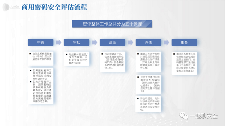 密评整体工作总共分为五个步骤,分别是申请、审批、建设、评估以及报备。首先由由信息系统责任单位(甲方)提出开展密评工作的申请,此时甲方如开展过密评工作则直接对该系统密码应用的安全性进行评估,如未开展密评工作,则需要确定该系统是否为新建系统,以此决定密码从业单位编制密码应用建设方案还是密码应用改造方案。