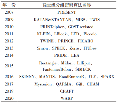 轻量级密码算法的起源可以追溯到 20 世纪 80年代,旨在保护工业领域的安全性,但那时设计的轻量级密码无法抵抗不断发展的攻击,安全性存在一定的缺陷。随着物联网技术的发展和相关应用的推广,大量的轻量化物联网设备催生了对轻量级密码算法的需求。2007 年,轻量级密码算法PRESENT[6] 发布,其超轻量的设计产生了巨大影响。