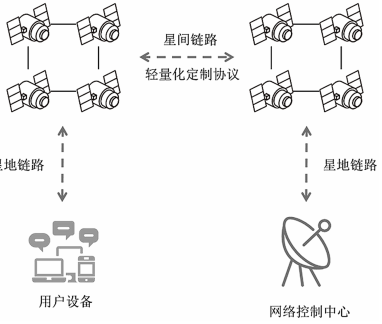 如图 7 所示,卫星通信网络分为星间链路和星地链路。星地链路是指从地球上的终端用户到卫星,然后返回到地球上的地面站点的通信链接。这种链路通常分为上行链路(用户到卫星)和下行链路(卫星到用户)。星地链路主要采用的通信协议是 5G等标准协议 ,由标准制定单位进行设计。而星间链路通信可以采用定制化协议。