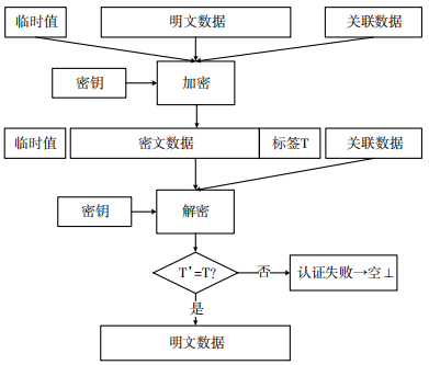 认证加密 AE 方案构造如图 3 所示,具体流程为:发送者将临时值、关联数据、明文数据作为输入,生成密文和标签 T,接收者进行解密并生成 T’,若 T’=T,则输出明文;否则返回空。