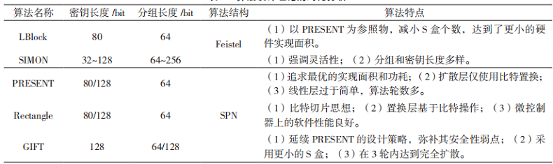 下面将从算法结构的角度选取 5 个国内外典型的轻量级密码算法进行介绍。