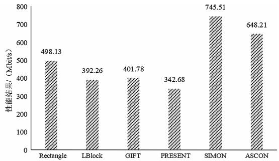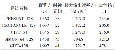 表格中分组密码算法的硬件实现面积均小于2 000 GE,单从面积指标上分析都满足资源受限环境场景,其中,64 bit 分组长度的 GIFT 算法实现面积最小。但在最大输出功率和能量消耗方面,密钥长度为 128 bit 的 Rectangle 算法以较小的实现面积在这两项指标中表现较为优秀。ASCON 算法的实现面积虽然较高,考虑到其具备认证加密功能和良好的吞吐量,该算法的表现也十分优异。