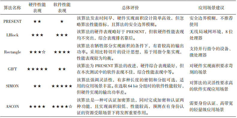 本 节 对 第 2 节 所 提 到 的 LBlock、SIMON、PRESENT、GIFT、Rectangle、ASCON 共 6 项 轻 量级密码算法进行细化的对比研究,分别从算法理论设计、算法硬件性能、算法软件性能等维度评估各项算法的基础能力。