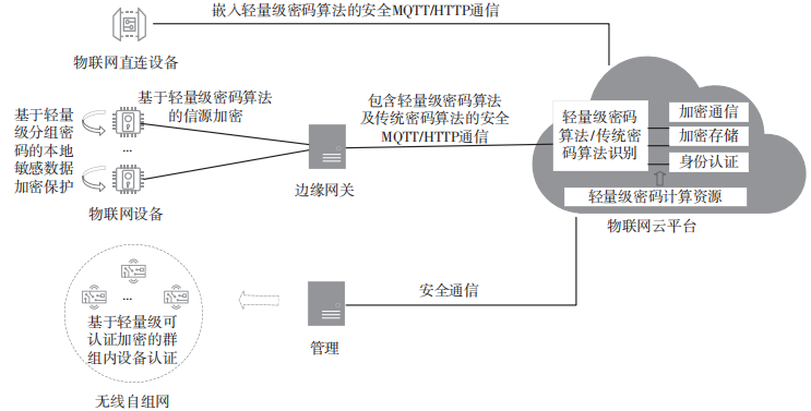 物联网的快速发展使得大量的设备连接到云端,这些设备在信息传输、数据存储及身份认证时均需进行密码保护。图 5 给出了轻量级密码算法在物联网“端—边—云”协同场景中的应用案例。对于直连物联网云平台的物联网设备,采用嵌入轻量级密码算法的安全 MQTT/HTTP 协议,确保“端—云”通信安全。对于“端—边—云”通信情形,在“端侧”的物联网设备内集成轻量级分组密码算法,实现本地敏感数据的快速加密;在“端—边”通信链路,使用基于轻量级密码算法的信源加密方式保证通信的安全性和高效性;在“边—云”通信链路,可选传统密码算法、轻量级密码算法等不同方案,确保安全通信的灵活性。对于自组网情形,可使用轻量级认证加密算法实现自组网内部快速的群组设备认证,提升自组网的安全性。