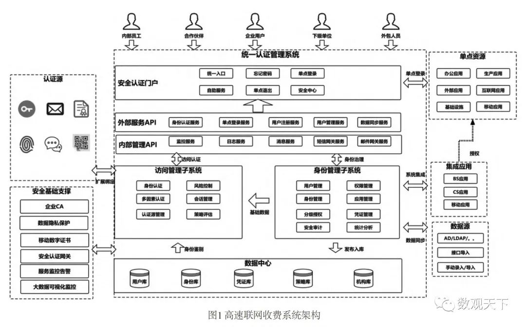 高速联网收费系统由数据中心、密码管理子系统、密码安全管理子系统组成。数据中心:存储基本的用户信息、用户身份、密码凭证、密码策略等数据;密码管理子系统:提供密码策略管理、密码规则自定义、密码周期维护、弱密码管理、设备资源密码管理、密码凭证管理等密码管理功能[3];密码安全管理子系统:实现多因素安全认证、风险动态密码管理、密码安全隐私保护、密码数据安全传输、密码数据灾备服务等功能;认证管理与密码管理系统与各应用进行集成,通过接口与收费业务系统进行对接,实现内部员工、运维管理人员等用户的登录认证。高速联网收费系统架构图如图1所示。