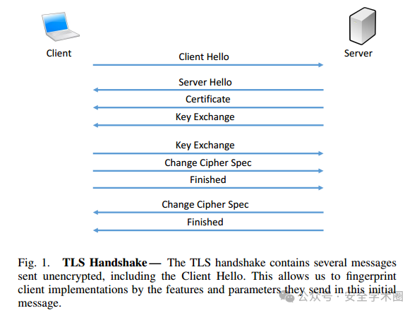 为了避免在使用TLS时遭到检测,反审查工具(如Psiphon、meek、Signal等)会通过模仿主流TLS客户端(如Chrome、Firefox)的指纹,来混淆其流量。然而,由于这些工具的TLS握手常常生成独特且稀有的指纹,审查系统能够通过指纹库识别并阻止这些流量。TLS握手过程如下图所示:
