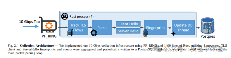 研究者在10 Gbps校园网络上设置了一个数据包监控系统,使用配备双端口Intel 10GbE网络适配器的单台服务器,捕获并过滤TCP 443端口上的TLS连接数据。研究团队用Rust编写了数据包处理代码,识别并解析TLS Client Hello消息,成功率达到96.7%。数据收集基础设施设计如下图: