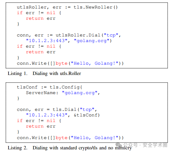 总体来说,uTLS提供了强大的工具,使得反审查工具能够更有效地规避TLS指纹识别,尽管仍存在一定风险。随着TLS协议的发展和浏览器/操作系统的更新,uTLS将继续适应这些变化,保持反审查工具的有效性。下图使用uTLS库和标准TLS库远程服务器进行连接并发送数据的对比,体现了uTLS的便利性。